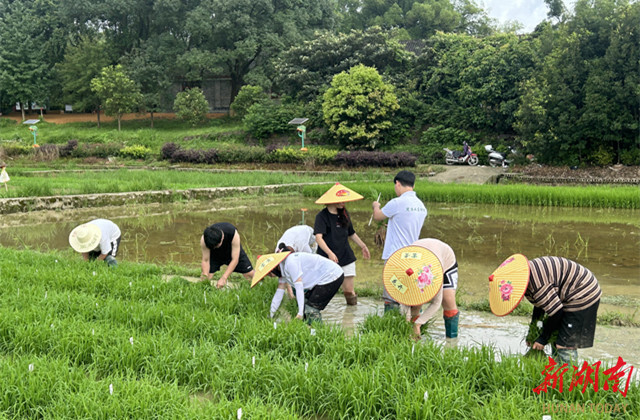 (2023级“楚怡工匠本科班学生在安江农校纪念园开展水稻移栽实训。)