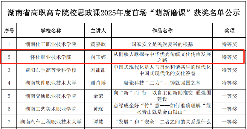 近日,湖南省高职高专院校思想政治理论课2025年度首场首场“萌新磨课”结果公布,我校思政课部教师向玉婷荣获特等奖。